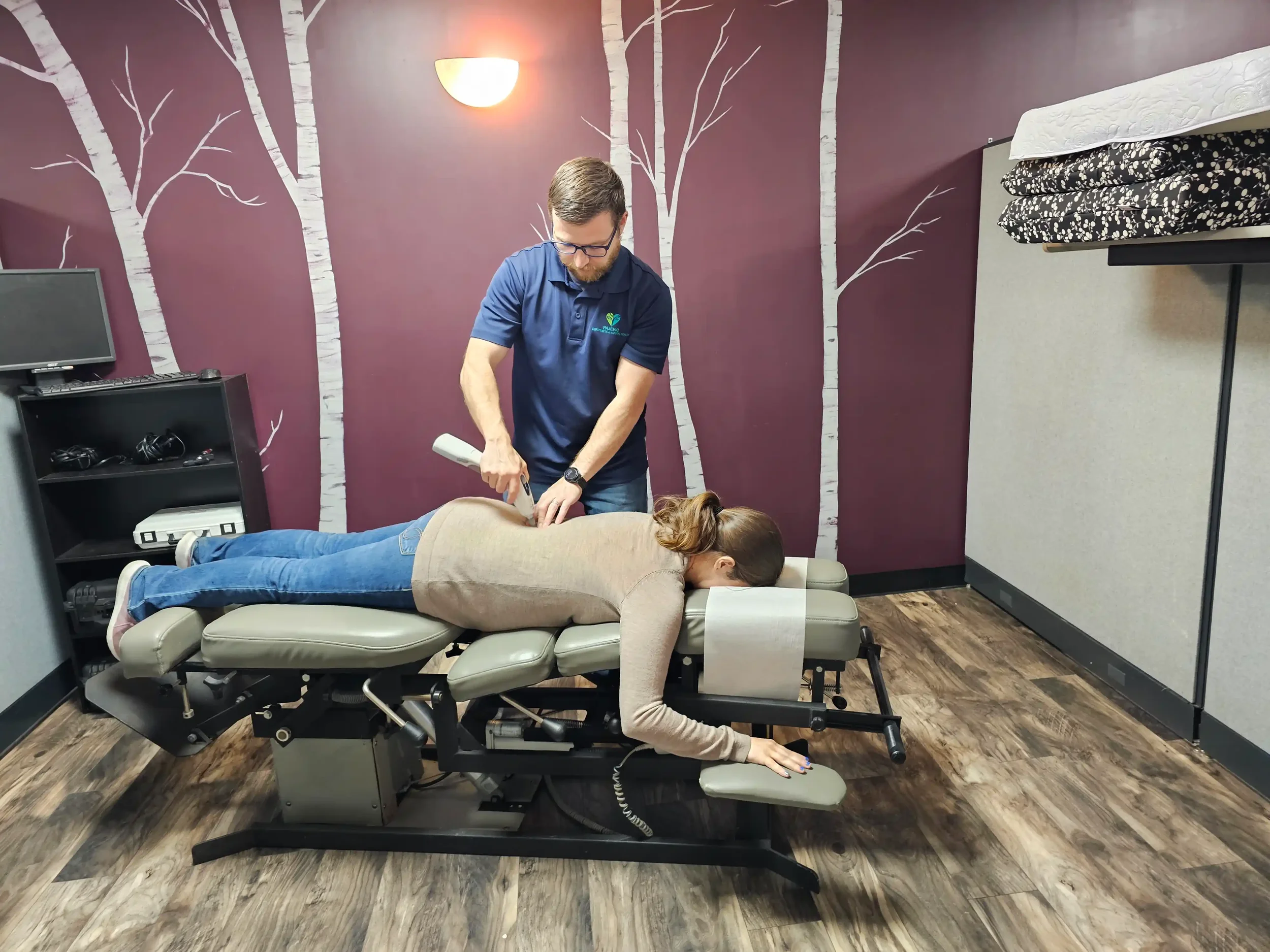 Combination of chiropractic adjustments, soft tissue therapy, laser therapy, and functional retraining.